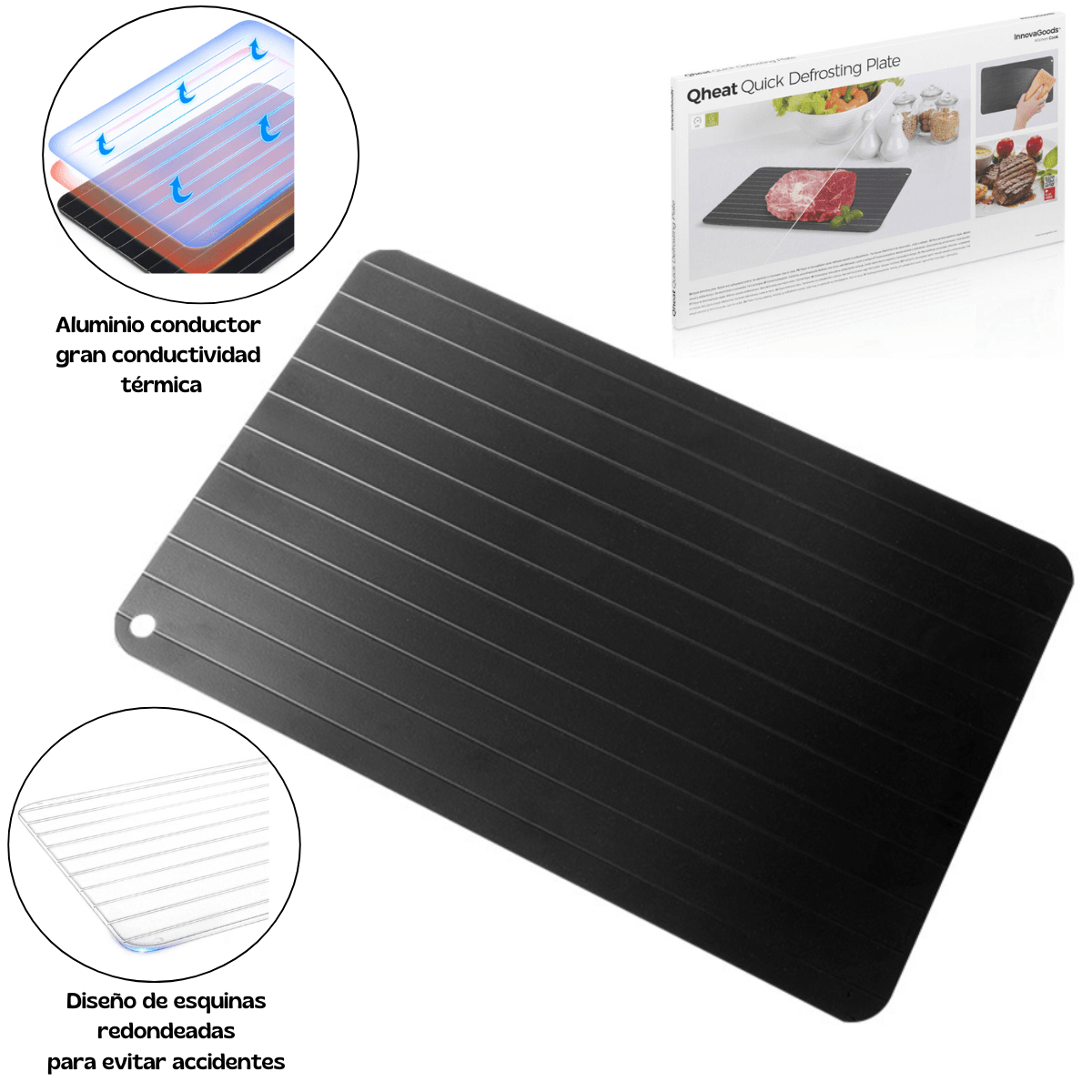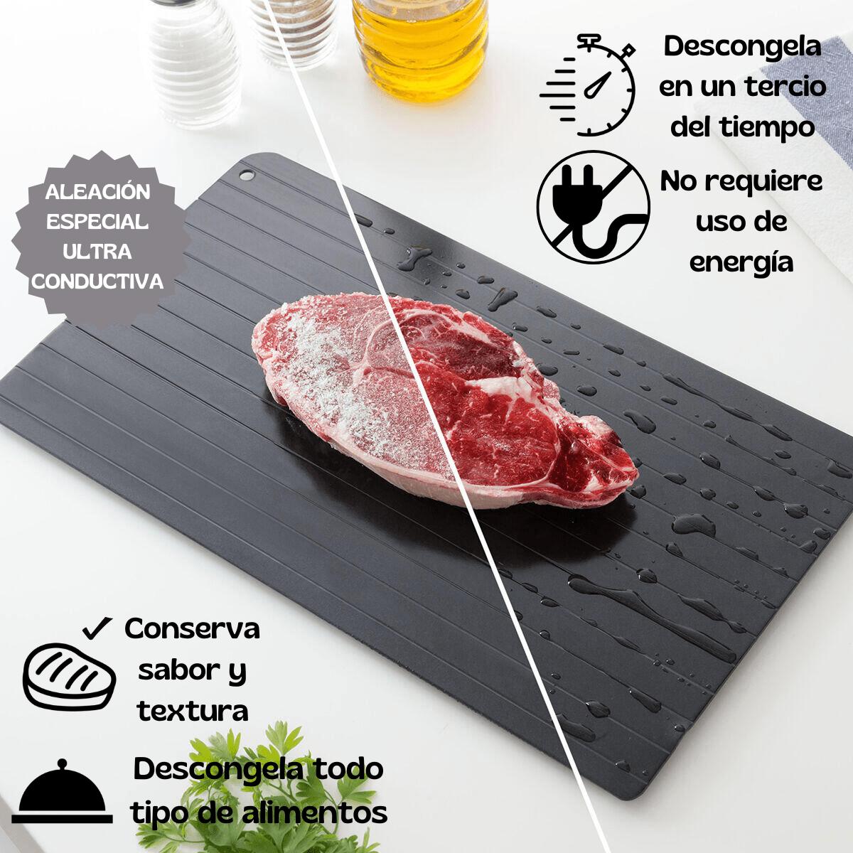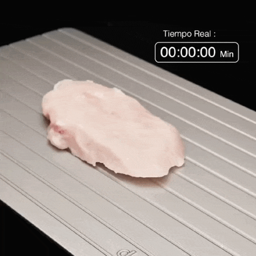Nuestra bandeja utiliza un material de aleación conductora térmica que acelera el proceso natural de transferencia de calor desde el ambiente al alimento congelado. Esto permite descongelar los alimentos de forma rápida y uniforme, sin necesidad de electricidad, agua caliente o pilas. Es un proceso completamente natural que no altera la calidad del alimento.
